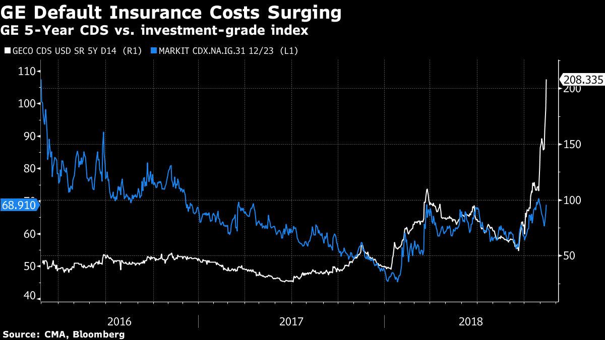 이렇게 글로벌 채권시장의 구루들이 위기를 열변하는 가운데, 최근 GE의 상황은 긴장하게 만들고 있다. GE는 최근 디폴트 우려가 증폭하며 주가가 폭락하고 CDS가 폭증하는 중이다.