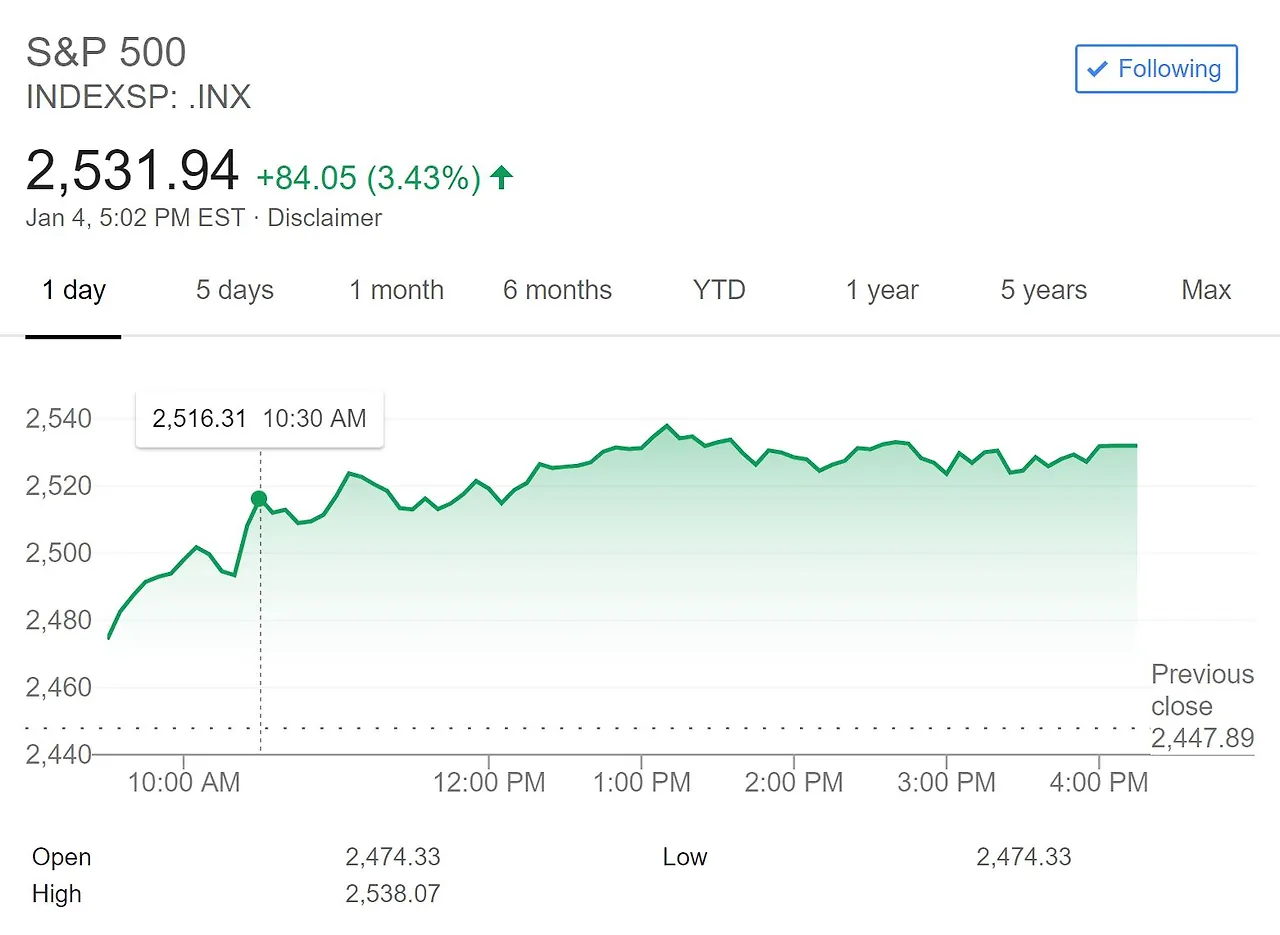 파월의 미국 경제의 견고함을 언급한 후 중국 경제의 리스크를 언급하면서 한번 점프를 했고, Fed 통화정책의 유연성을 언급하니 한 단계 더 점프를 했다. 현재, 미국의 금융시장은 글로벌 경제 둔화에 대한 리스크를 반영하고 있는 것이기 때문이다. S&P500 intraday chart로 확인해 볼 수 있다.