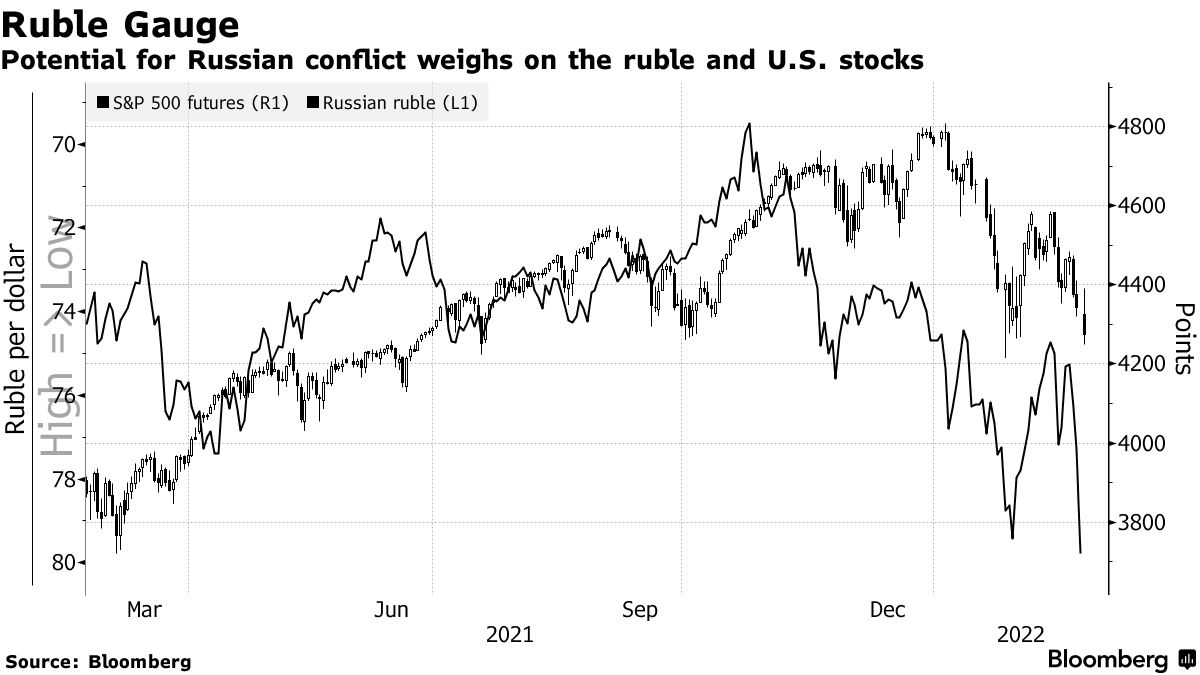 Goldman Sachs에 따르면, 우크라이나의 '온전한 충돌'과 '징벌적 제재'가 맞물려 미국증시는 지난주 금요일(18일) 종가 대비 6% 정도 하락할 수 있으며, 유럽과 일본 증시는 이보다 더 큰 손실을 볼 수 있다고 한다. 이는 지정학적 위험이 극대화되는 가운데, 최근 루블에 대한 글로벌 자산의 민감도에 근거하고 있다. 최악의 경우 루블이 달러 대비 10% 하락할 경우 유가가 13% 상승하고, 미국채 10년물은 27bp 하락할 수 있다.