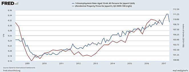 차트에서 보면, 주택가격이 오르면서 실업률은 떨어지고있다(차트에서 실업률은 invert 시켰음).