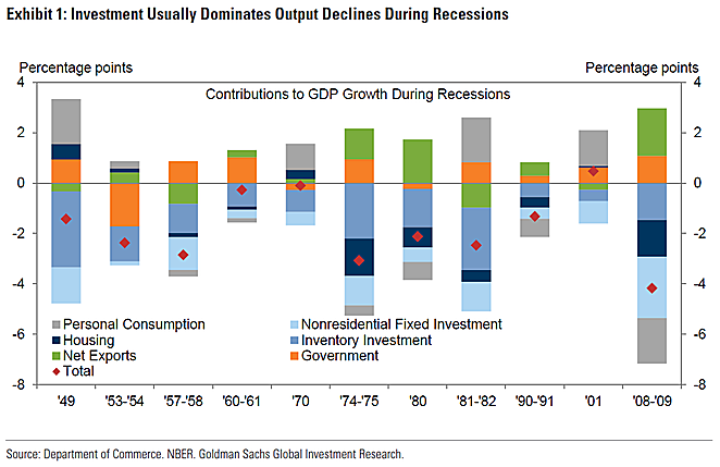 Recession을 이끌었던 요인들을 살펴본 결과 가장 중요한 교훈은, 일반적인 소비는 Recession이 아닌 상황에서도 감소하기도 하지만, 투자지출(재고, 자산, 집)은 생산(output)이 줄어드는데 가장 크게 기여한다. 이러한 결과는 IMF의 다른 선진국들에 대한 조사 결과와도 같다.