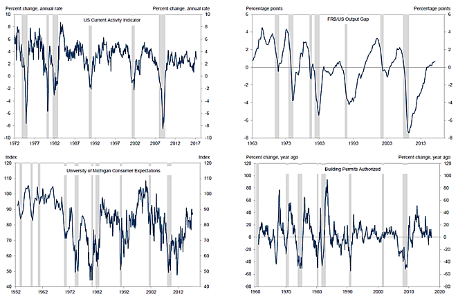 실제 Recession의 흔한 요인들은 미국의 현대 경제에서 큰 문제가 되지 않는다. 예를 들어 IMF에서 규정한 다섯 가지 중 2가지, 외부 수요와 재정쇼크는 미국을 Recession으로 이끌만큼 영향력이 크지 않으며, 오일쇼크 역시 세일가스로 인해 물가 변동에 큰 영향을 주지 않는다. 긴축 재정정책은 현재 덜 위협적인 요소인데, 왜냐하면, 예상 물가가 Fed의 목표와 더 긴밀하게 연계되어 있으며, 오일쇼크는 물가에 덜 영향을 주기 때문이다.
