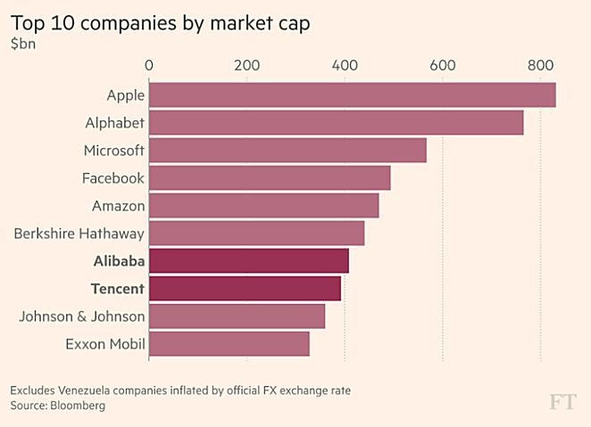 지난 쿼터 Tencent와 Alibaba의 시가총액은 세계 10대 기업 안으로 치고 들어갔다. 주식 상승세가 이어지고 있는 가운데 올해 들어서만 70% 이상의 상승을 기록했으며 이에 각각 시가총액 7위와 8위에 랭크되었다. 물론 아직 갈길은 멀다. Alibaba와 Tencent를 합쳐도 Apple의 시가총액에는 못미친다.