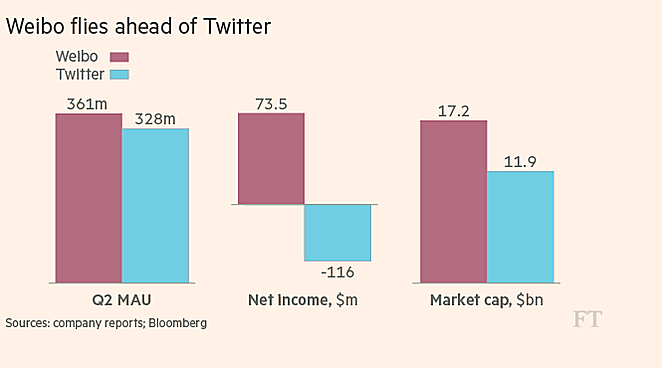 2014년 4월 Sina Weibo가 2억 8천 5백만 달러의 시가총액으로 주식시장에 등장했지만 트위터에 비하면 피라미에 불과했으며 게다가 적자를 기록하고 있었다. 3년 조금이 안되는 사이에 Weibo는 트위트를 훌쩍 뛰어넘어 버렸다. 젊은 가입자들이 라이브 스트림에 열광하면서, 셀러브리티나 트렌드 세터, 그리고 오피니언 리더들로 하여금 지지를 얻고 팬층 확보 하기 위해 Weibo의 플랫폼 사용을 필수로 만들어 버린 것이 주된 이유였다.