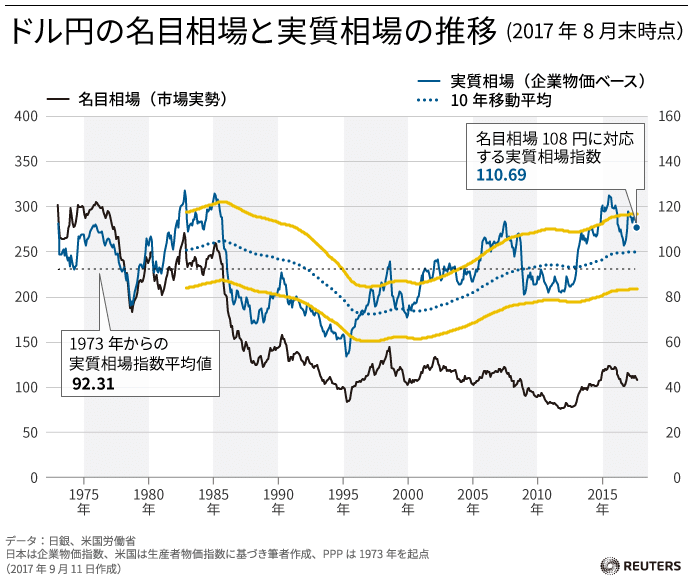 1973년 변동 환율제 전환 이후의 달러엔 시세를 보면, 실질환율이 추세적 평균치에서 크게 괴리하는 움직임은 고점 6회 저점 5회가 평균 4년 기간으로 반복되고 있다. 현재는 6번째 고점에서 조금 내려온 상황이다.