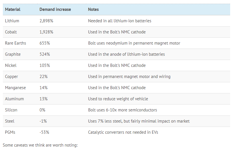UBS 리포트에서 이 "100% 전기차 세계"를 가상한 실험을 소개했다. UBS Evidence Lab Initiative의 일환으로 대표적인 전기차인 Chevy Bolt를 분해하여 내부에 어떤 부품이 있는지 정확하게 파악한 다음 39명의 애널리스트를 통해 분석을 하게 했다. 차량에 사용된 금속 및 기타 재료를 분해한 후 보니, 표준 내연기관 자동차에 사용되는 것과 상당한 차이가 있음을 발견했다. 그것은 배터리팩이 아니었으며, 차체와 영구자석동기모터였다. 분석의 일부로서, 현재의 자동차 믹스 대신에 세계 자동차 수요의 100%가 Chevy Bolts라 가정한 시나리오에 의해 분석되었다.