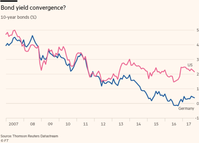 두 중앙은행이 서로 다른 정책 속도로 운영하고 있는 것은 사실이지만, 채권시장은 이미 벤치마크 10년 수익률로 측정한 바와 같이 그 격차를 줄이기 위한 과정을 시작했다. 10년 만기의 미국 국채와 독일 분트 수익률 사이의 최대 격차는 2016년 말에 2.35%p였다. 올해는 1.80%p로 좁혀졌으며 이는 유로 강세에 영향을 끼쳤다. 이러한 수렴 추세는 당분간 그대로 유지될 것이다.