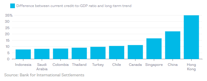 중국당국이 그들의 부채를 통제하고 있다고 생각하는 것이 이상할 정도다. 일부 지역에서의 누적 증가 속도가 더디게 진행됨에도 불구하고 여전히 가계 등에서의 버블은 여전하다. BIS가 평가하는 한가지 조기경보 격의 지표, 즉 기업 및 가계신용의 GDP 대비 비중을 보자면 중국과 홍콩은 여전히 가장 위험한 나라로 평가되고 있다. 아래 그림에서 볼 수 있다.
