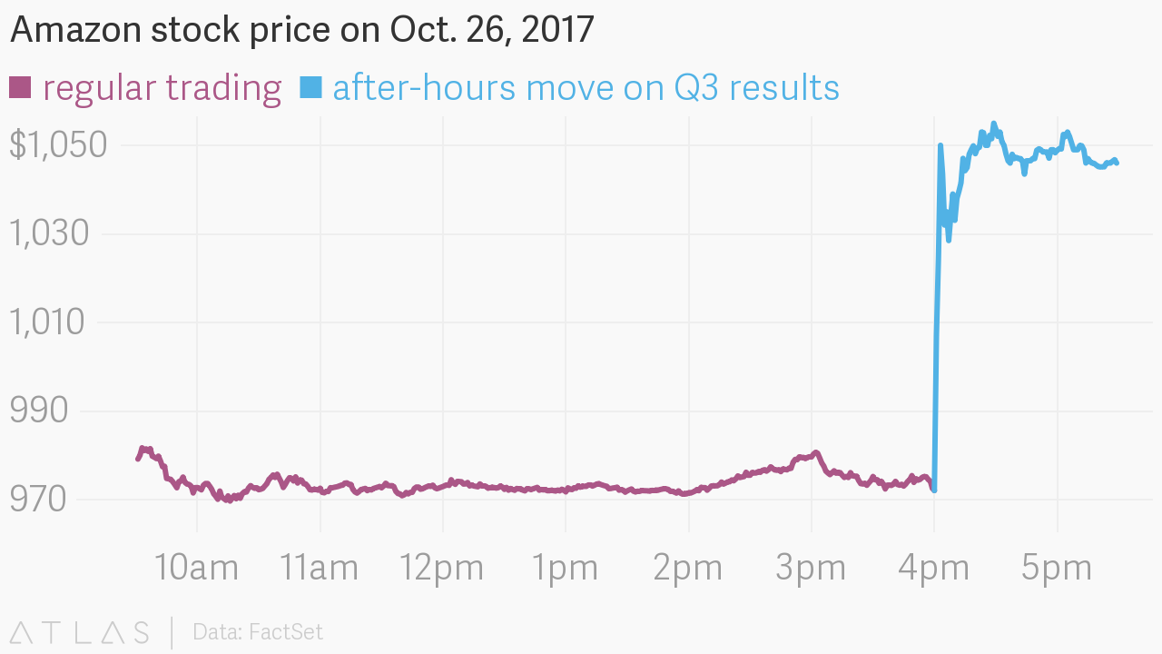 아마존 주가는 10월 26일, 기대를 뛰어넘는 3분기 실적이 발표되면서 시간외 거래에서 8% 급등했다. 아마존은 2억 6,500만 달러의 이익을 기록했으며, 이는 전년 동기 순이익과 거의 비슷한 수준. 애널리스트들이 기대했던 420억 달러를 뛰어 넘는 437억 달러의 매출액을 기록하면서 전년 대비 34% 증가한 모습을 보여 주었다.