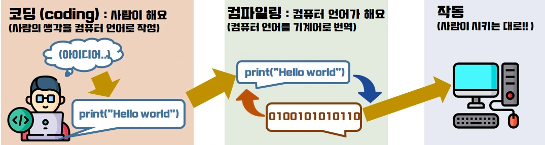 라고 명령어를 입력하면 처음 생각한 것을 표현할 수 있죠. 이 때 Python과 같은 중간 언어를 가리켜 ‘컴퓨터 언어(computer language)’라고 합니다. 파이썬에서 화면에 출력을 하라는 명령어 print라는 명령어와 괄호, 따옴표 등과 같은 명령어, 부호들을 가리켜 '코드(code)'라고 부릅니다. 다양한 코드를 활용하여 명령어를 작성하는 것을 '코딩(coding)', 코딩 활동을 통해 전체적 프로그램을 작성하는 활동 전체를 가리켜 '프로그래밍(progaming)'이라고 합니다. 마치 코딩을 통해 프로그램을 만드는 것은 작문을 통해 작품을 만드는 것과 비슷하다고 할 수 있습니다.