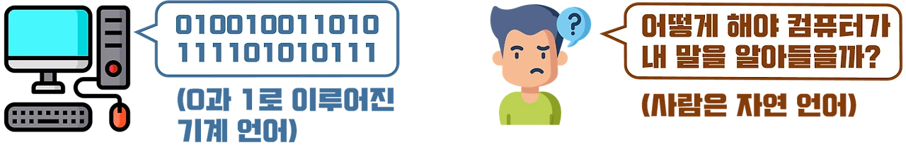 컴퓨터도 마찬가지입니다. 우리의 생각을 컴퓨터가 알아들을 수 있는 0과 1로 이루어진 기계어로 바로 바꾸지 못하기 때문에 중간 언어가 필요합니다. 예를 들어 화면에 ‘Hello World’라는 문자를 표현해야겠다는 생각을 했다고 해봅시다. 다양한 프로그램 중 Python이라는 언어를 사용해서