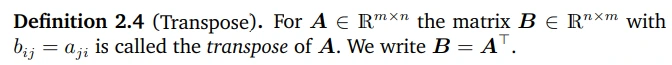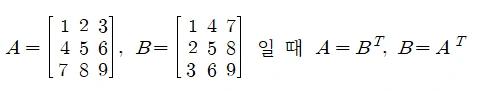 행렬 A와 B에 대하여 B가 대각선의 성분을 기준으로 A와 대칭을 이루면 두 행렬을 서로 transpose라고 합니다.