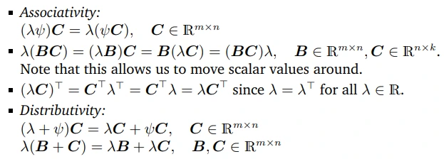 실수배는 행렬의 합과 곱, transpose 등에 대해 다음과 같은 성질이 성립해요.