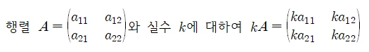 행렬 A에 대하여 각 성분의 값을 같은 값을 곱해주는 것을 스칼라곱이라고 하며, 주로 실수를 다루기 때문에 실수배라고 예전 고등학교 과정에서 배웠습니다.