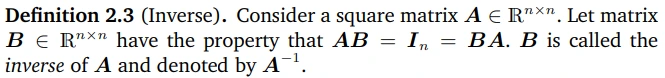 이 존재할 때 B를 A의 역행렬이라고 합니다. 마치 숫자의 역수같은 역할을 하게 되죠. 그래서 B를 A의 역행렬이라고 해서 A^-1로 표현합니다. 다음 책의 내용으로 수식을 확인해봅시다.