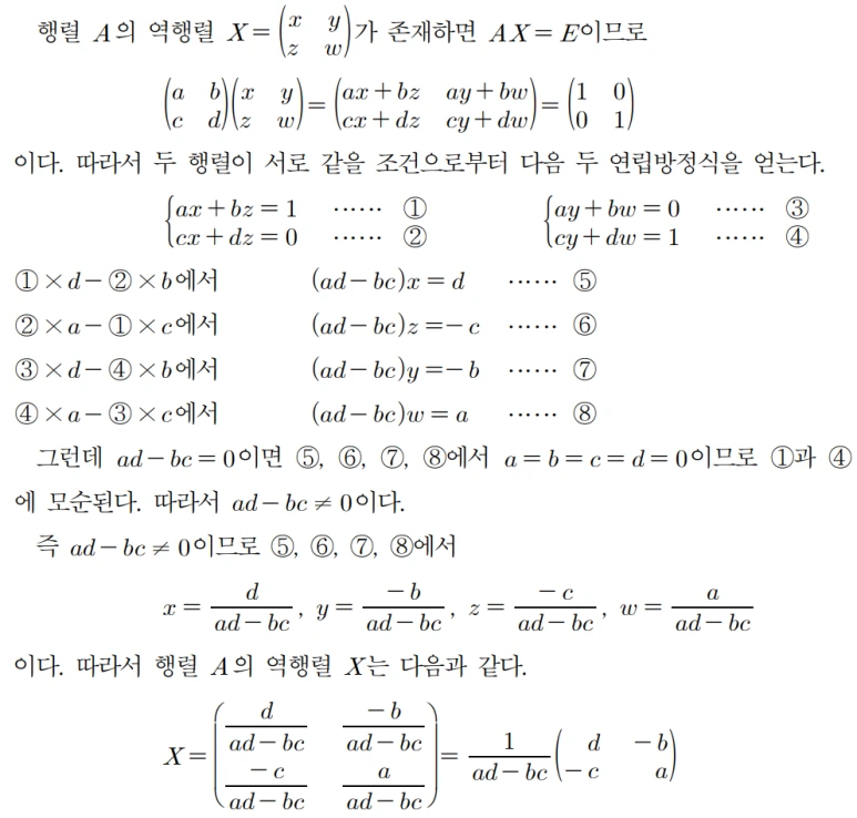 이러한 역행렬은 항상 존재하지는 않습니다. 2차 정사각행렬은 고등학교 예전 교육 과정에서 배웠는데요, 교과서의 내용을 살펴보면 다음과 같습니다.