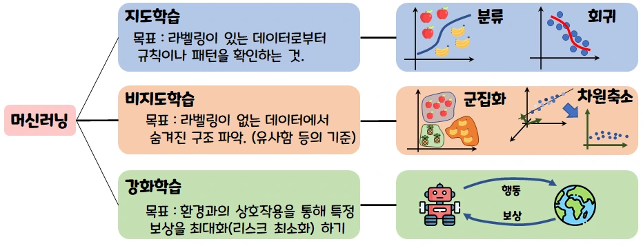 먼저 큰 틀부터 한 번 정리해볼까요? 인공지능의 학습은 데이터의 특성과 사용 목적에 따라 크게 지도 학습과 비지도 학습으로 구분할 수 있다고 앞에서 설명했습니다.