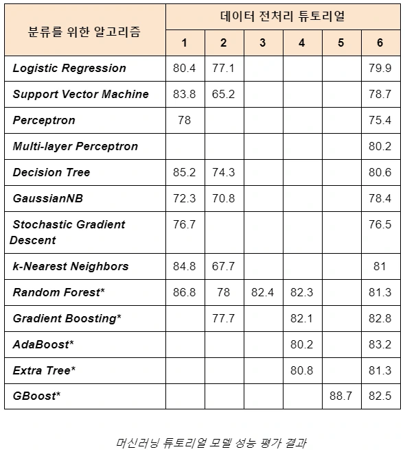 마찬가지로 같은 데이터라고 하더라도 ‘원하는 결과가 분류인가, 예측인가?’에 따라 데이터를 다루는 방법이 달라집니다. 또한 데이터의 특성이나 데이터 전처리 과정, 사용하는 알고리즘에 따라 모델 성능의 결과가 다르게 나오기도 합니다. 아래의 표는 2019년 대한 임베디드 공학회 논문지(대한 임베디드공학회 논문지 제14권 제4호)에 실린 논문 텐서플로우 튜토리얼 방식의 머신러닝 신규 모델 개발 : 캐글 타이타닉 데이터 셋을 중심으로 (김동길 외)의 내용입니다. 이 논문에서는 캐글에서 공개한 타이타닉 생존자 데이터를 6가지 방법으로 전처리를 하여 6개의 머신러닝 튜토리얼을 바탕으로 다양한 알고리즘을 적용해서 각각의 모델의 성능을 비교한 결과를 아래와 같이 발표하였습니다.