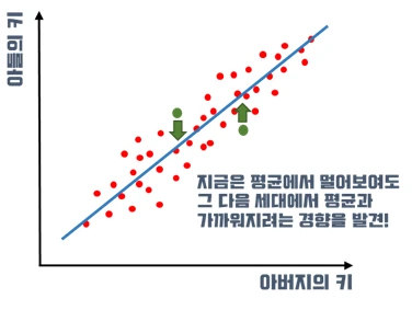 우생학을 연구하던 생물학자 프랜시스 골턴(Francis Galton)은 아버지의 키와 아들의 키를 연구하던 중 재미있는 사실을 하나 발견하게 되었습니다. 아버지의 키가 평균보다 크면 아들의 키는 아버지보다 작을 확률이 높고, 아버지의 키가 작은 경우는 아버지보다 클 확률이 높아진다는 것입니다. 따라서 세대가 지나더라도 키의 분포가 거의 일정하게 유지될 수 있었음을 설명했습니다. 이 현상을 보고 골턴은 ‘평균으로의 회귀 현상(regression to the mean)’을 증명하기 위해 ‘회귀분석’이라는 방법을 만들었습니다.