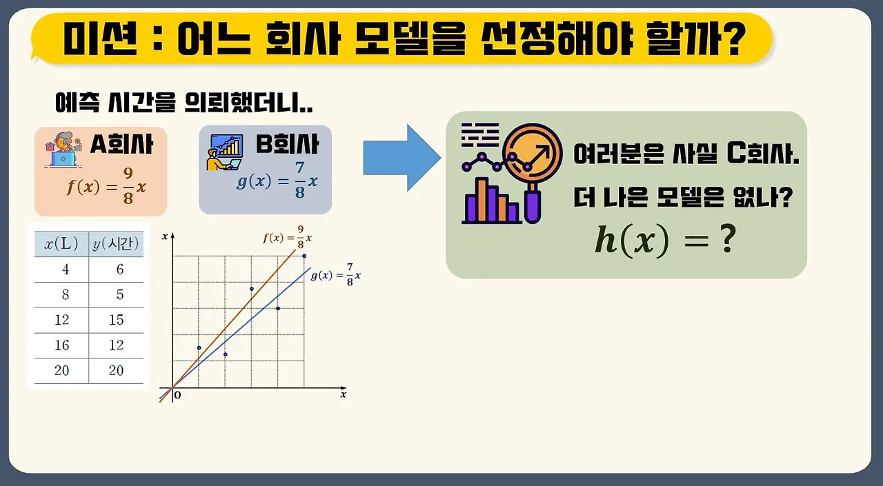 잠시 인공지능 수학 교과서에 소개된 예시 하나를 가져와볼게요. 다음의 예시는 미래N 교과서에 소개된 손실 함수의 도입부의 예제입니다.