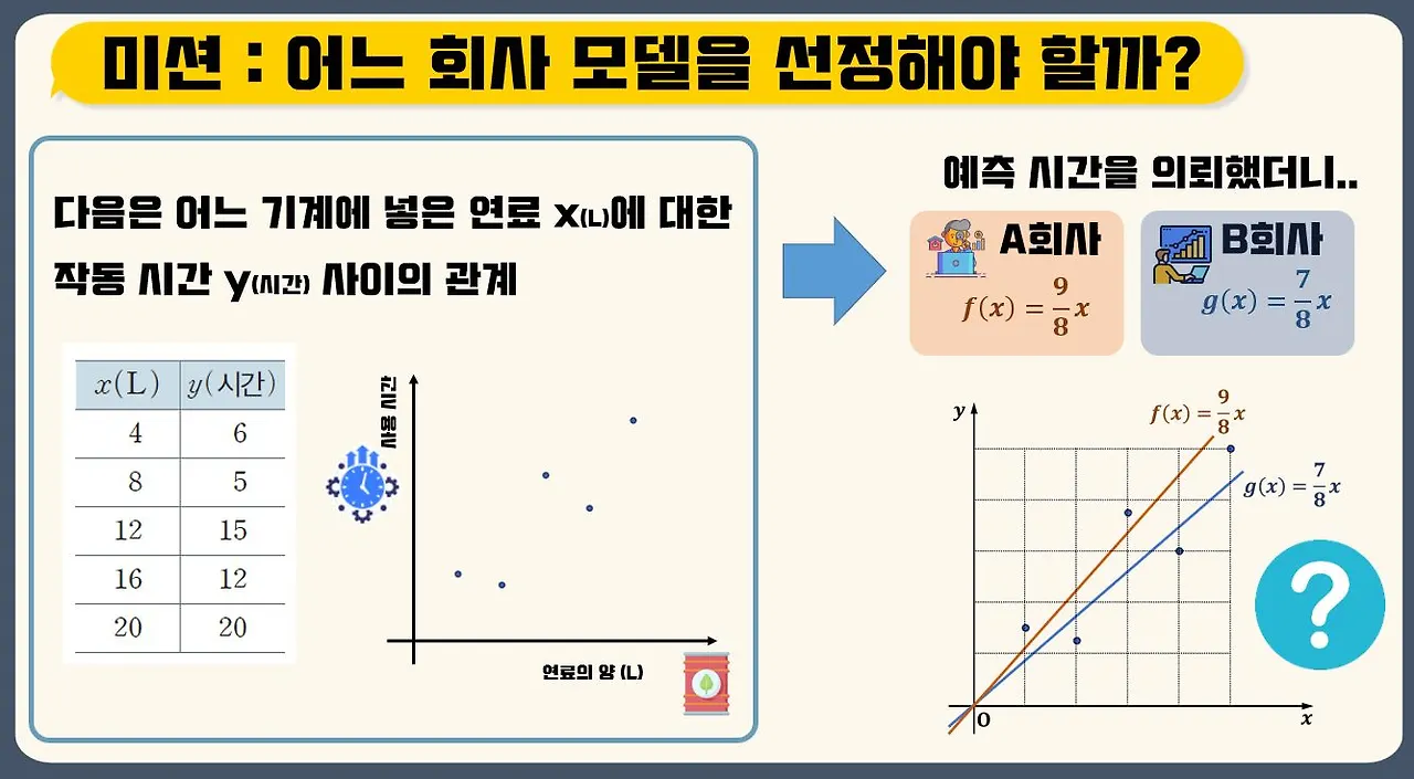 어느 기계가 있는데 이 기계는 연료의 양과 그에 따른 작동하는 시간을 조사했더니 왼쪽 표와 같은 결과를 얻었습니다. 대략적으로 연료의 양이 늘어날수록 가동시간이 증가하는 추세를 보이는 것을 볼 수 있습니다. 이를 y=ax라는 형태로 회귀 분석을 통해 예측 모델을 만들려고 합니다.