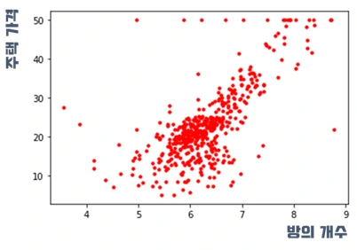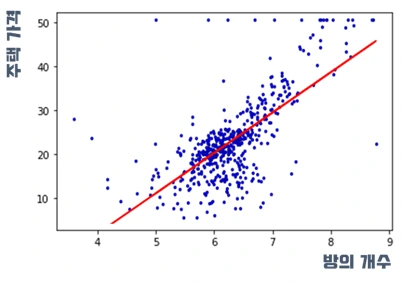 실제로 데이터 학습에서 많이 사용하는 보스턴 지역의 주택 가격 데이터 셋에 실려있는 주택의 가격의 분포들입니다. 이 자료들을 회귀 분석을 통해 추세선을 그어보면 오른쪽과 같이 구할 수 있습니다. 추세선을 통해 방의 개수에 따라 주택 가격을 예측할 수 있습니다. 방이 6개라면 가격대가 대략 얼마인지를 대략적으로 계산을 할 수 있게 되죠. 또한 방의 개수와 주택 가격에 대한 분포의 추세를 알 수 있기 때문에 “방의 개수에 비해 생각보다 주택 가격이 비싼데?” 와 같이 판단의 기준을 가질 수 있습니다. 이처럼 선형 회귀는 숫자 속성을 가지는 하나, 혹은 그 이상의 값들을 통해 다른 속성의 값을 예측하는데 주로 사용합니다.