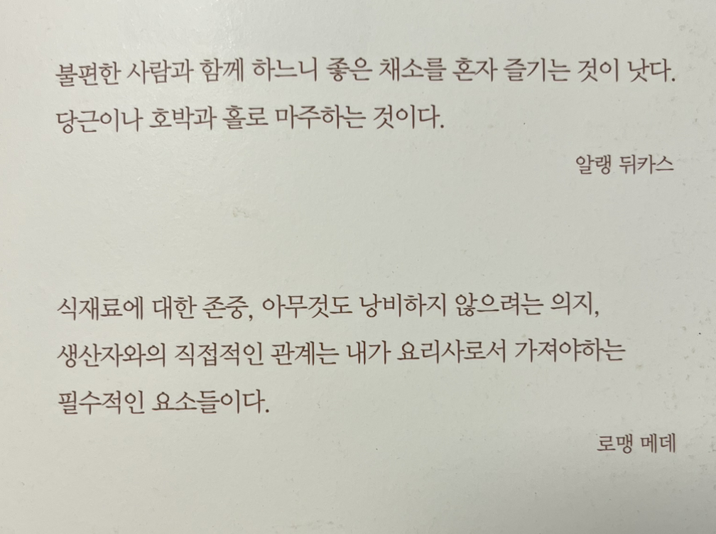 내가 생각하는 요리사가 하는 일 은 돈을 받기 때문에 당연히 해야 하는 일인 거고, 요리사로서 해야 하는 일은 이러한 것들을 고민하고 개선할 수 있는 방법들을 찾아가야 하는 게 아닌가 싶다. 나부터 자부심을 갖고 진심으로 대하면서 내 직업에 가치를 높여야지 더 좋은 환경에서 일할 수 있고 손님이 왕이기 때문에 맞춰야지가 아니라 손님들이 내 음식을 먹기 위해 노력해서 오는 구조를 만들 수 있지 않을까 싶다.