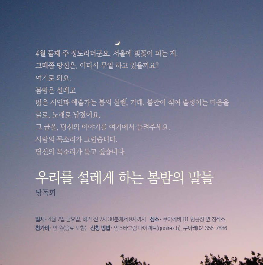 내용· 봄밤의 낭독회. 봄을 맞는 가지각색의 설렘을 표현한 작품을 여러 낭독자의 목소리로 듣는 자리