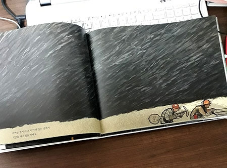 마지막 두어 펼침면, 소년의 말을 천천히 읽어내리다 보면, 그 뒤로 깔린 어둠에서 밤의 포근함 대신 가슴이 서늘해짐을 느낀다. 자신도 탄광에서 일하게 될 거라고, 이 마을에서는 다 그런다고. 바닷물이 햇빛에 반짝이던 모습을 보던 소년이 몇 년이 더 지나면 바다 밑 검은 세계로 향하게 될 것이다.