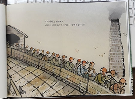일을 이야기할 수 있는 그림책은 진작에 원했다. 그런데 어렴풋한 이미지, 책 속 장면 하나씩은 생각이 나도 확 끌어당기는 책은 생각나지 않았다. 『리디아의 정원』이나 『바구니 달』도 일에 대한 이야기일 수 있다. 하지만 밥벌이의 지겨움, 많은 시간을 공들이고 고민하게 하는 직업을 이야기하기에는 만족스럽지 않았다. 그렇다고 내가 지금 말하려 하는『바닷가 탄광 마을』이 일을 주제로 이야기를 풀어내려고 산 책은 아니었다. 근래에 보기 드물게 안정적인 그림책이어서 골랐는데, 읽을수록 두 작가에게 쌓여 있는 이야기의 힘과 그것을 풀어내는 힘에 빨려들어간다.