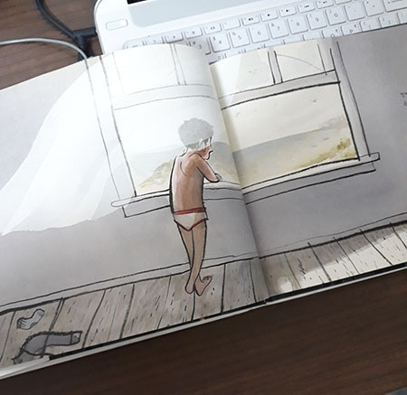 『바닷가 탄광 마을』은 내가 산 책 중에서 최신간으로 분류할 만한 책이다. 나는 자꾸 10년도 더 전에 출간된 책들을 사 모으고, 번역 그림책은 원 출간연도가 1950년대~1990년대인 책들에 눈이 간다. 그러니 2017년 12월에 나온 『바닷가 탄광 마을』은 최신작에 속한다. 수묵화처럼 선이 살아 있는 드로잉과 은은한 색채로 이야기를 전달하는 점이 마음에 들었다. 담백하게 이야기를 풀어가되 메시지를 짐작하게 하거나 메시지의 충격을 은은히 전하는 그림책을 만났을 때 안도감을 느낀다. 실험과 시도로 한 장 한 장을 이어가는 책들 속에서 이런 그림책은 고전적 문법을 따르는 그림책이라는 생각도 든다. 이 그림책들이 나를 끌어당긴다. 『바닷가 탄광 마을』은 처음에는 큰 힘으로 끌어들이지는 않았다. 드로잉 실력, 담백한 글의 묘미, 글과 그림의 어울림이 안정적이고, 이런 점이 내가 곧잘 사들이는 고전 그림책의 연장선으로 보였다.