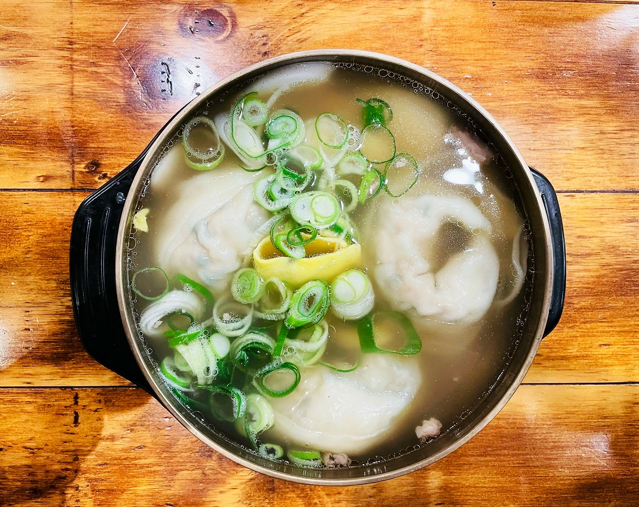 떡 만두국은 탕반에 들어가는 국물에 밥 대신 만두를 넣어 나옵니다. 만두는 3개가 들었고 작은 주먹 크기로 제법 양이 됩니다. 만두는 손으로 만든 것처럼 피가 두껍습니다. 만두 소는 고기와 야채로 채워져 있습니다. 떡이 많이 들어간 만두국이 아닙니다. 만두가 메인이고 떡은 맛을 볼 정도 양입니다. 양이 부족하면 밥을 준다고 합니다. 밥은 서비스로 나오나 봅니다. 밥이 들어간 탕반을 먹을까 하고 그리 고민했었는데 밥을 준다네요. 파는 같이 나오지 않고, 테이블마다 준비되어 있습니다. 썰어 놓은지 오래돼 보이지 않고 신선해 보입니다.