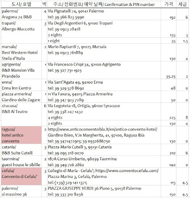 라구자와 체팔루cefalù는 홈페이지를 통해 예약했다. 홈페이지로 예약을 요청했더니 다음날 이메일로 답장이 왔다. 라구자는 날짜를 변경해야 했고, 체팔루는 예약 확정 방법에 문제가 있어, 두 곳 모두 전화로 문제를 해결했지만, 그런 번거로움을 감수할 만큼 충분히 좋았다.