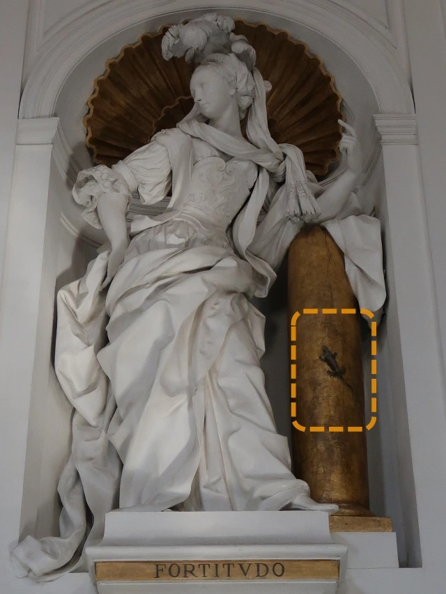 P.S. 세르포타는 도마뱀 또는 작은 뱀이란 뜻이란다. 그래서 그는 자주 도마뱀 모습을 사인처럼 작품에 남겨놨다고 한다. 이곳에도 용기를 뜻하는 fortitudo의 기둥에 시칠리아에서 흔히 눈에 띄는 작은 도마뱀이 있다.
