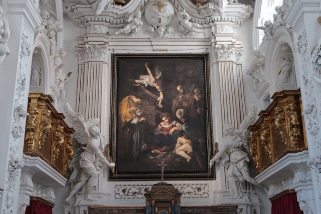 제단화는 카라바죠caravaggio가 두 성인이 동석한 가운데 예수가 탄생한 장면을 그린 작품 Natività con i santi Lorenzo e Francesco d'Assisi인데, 현재 걸려있는 것은 복제화라고 한다. 오리지널은 1969년에 도난당했는데, 마피아의 짓으로 추정되고, 아직도 미제 사건으로 FBI의 10대 예술품 범죄 목록에 올라있다고...