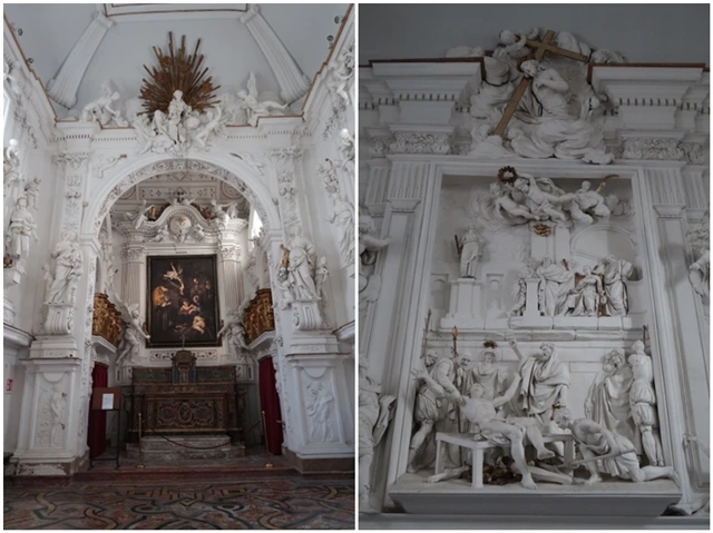 BBC에서 제작한 sicily unpacked라는 동영상을 미리 보지 않았더라면 약간 충격적이었을 것 같다. 하나하나는 바로크 건축물에서 흔히 보이는 스투코 장식인데, 공간 전체를 보면 이렇게 장식할 생각을 어떻게 했을까 놀랍다. 종종 천국을 온통 하얗게 묘사한 걸 보긴 했지만, 실제 공간을 이렇게 채도나 명도의 변화조차 없는 한 색으로 장식한 건 처음 보지 싶다. 단순한데 파격적이라는 아이러니. 지금도 그렇지만 당시에는 더욱 새로운, 낯선, 혁신적인 아이디어이지 않았을까... 왠지 파괴적이지 않은 탈피나 조화로운 저항으로 보인다. 이렇게 독특한 공간은 시칠리아에 밖에 없지 않을까... 잘 보존됐음에도 하얀 스투코 조각들에서 시간의 때가 보인다. 모두 대리석 조각처럼 눈부시게 빛나던 시절에는 얼마나 더 경건하고 아름다운 공간이었을까 상상이 된다.