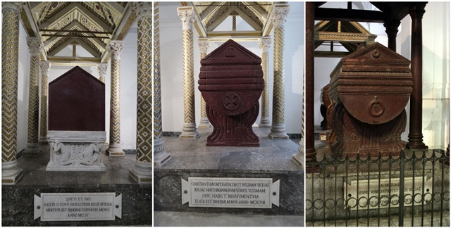 루제로 2세는 체팔루 성당에 왕실의 무덤을 만들려 했었다고 한다. 그래서 그곳에 두 개의 반암 석관을 마련해 두었는데, 체팔루 성당이 완공되지 않아 묻히지 못하고 팔레르모에 묻혔다. 그 관들은 체팔루에 계속 있었는데 외손자 페데리코 2세가 강탈하듯 이곳으로 가져왔다고 한다. 루제로 2세가 자신의 관으려 쓰려던 것에는 페데리코 2세가 있고 다른 것에는 그의 아버지, 즉 루제로 2세의 사위인 헨리 6세가 잠들어 있다고 한다. 헨리 6세가 있는 관의 전 주인은 노르만 왕조의 왕 tancredi였는데, 적통은 아니라도 루제로 2세의 손자이자 헨리 6세의 정적이었단다. 헨리 6세는 정적의 관에서 잠들고 싶었을까? 세상에 관이 하나만 있는 것도 아닌데... 지금으로서는 이해할 수 없는 당시 복수의 문법이다 싶다. 중세 교회 지하묘지에 왜 로마시대 석관이 그렇게 많을까 했었는데 그 의문이 이제 풀린다. 관을 리사이클하고 있었던 것이다. 우리로서는 상상할 수도 없는 장례풍습이 아닌지... 죽음과 장례에 관한 한 생각이 진짜 다르구나 싶다. 신성함과 엄숙함에 대한 다른 생각... 남의 시신은 막 꺼내고 그러면서, 누군가에 의해 꺼내질 자신의 시신은 왜 그리 좋은 관에 잘 보존하려 애썼을까?