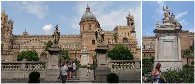 광장 중앙에는 팔레르모의 수호성인 산타 로잘리아의 조각상이 있다. 성당은 오랜 세월만큼이나 많은 변화가 있었단다. 서쪽 입구는 13-4세기 고딕 스타일로, 남쪽 입구는 15세기에 카탈루냐 고딕 스타일로 보수됐단다. 돔은 18세기말에 추가됐는데, 이로 인해 외관은 물론 내부에도 큰 변화가 있었다고 한다. 돔을 못마땅해했다는 글을 여기저기서 읽었는데, 내 눈에는 돔이 그다지 이질적이거나 거슬려 보이지 않는다. 내게는 이 모습이 팔레르모 성당의 원래 모습인 거다. 이 모습에 대대적인 변화가 생긴다면 나도 마냥 환영하고 좋아할 수는 없을지도...