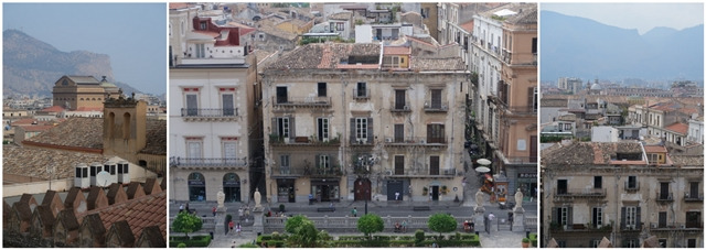 폐쇄공포증이 없거나 있다면 극복해야 닿을 수 있는 지붕 테라스 여행은 언제나처럼 보람 있다. 뻥 뚫린 하늘 아래 산을 배경으로 나지막이 자리 잡은 팔레르모 전경이 다 보인다. 마씨모 극장이 보이고, 그 뒤로 보이는 산이 몬테 펠레그리노라고 한다. 색다른 풍경과 색감이 있다. 가만히 있어도 하늘이 시야를 가득 채우는 곳에 있으니 새삼 고개를 꺾어야 비로소 너른 하늘이 보이는 곳에 갇힌 듯 살고 있음이 자각된다.