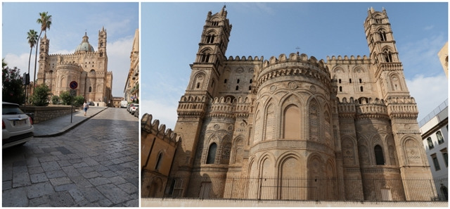 걷다 보니 성당Cattedrale di Palermo 앱스apse 외관이 보인다. 앱스 양쪽에 우뚝 서있는 탑과 옥색 돔도 보인다. 어머, 내 스타일이야 라며 마음이 호들갑을 떨며 난리다.^^ 아랍 노르만 양식 성당이 이런 거구나... 12세기 착공된 후 완공 시점을 특정해 선언할 수 없을 만큼 공사기간이 길었지만 앱스를 포함한 동쪽면의 아랍-노르만 스타일 외관은 12세기에 완성됐다고 한다. 이후 돔도 추가되고 많이 바뀌었지만 앱스와 앱스 양쪽에 우뚝 솟은 두 탑은 당시 모습을 유지하고 있단다.