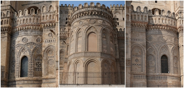예쁘다. 앱스apse의 형태와 무늬, 색의 조화가 완전 내 취향이다. 이슬람 고유의 기하학적 패턴의 붉은 바탕 위에 검은 현무암으로 수놓듯 아라베스크 무늬를 만들었다. 투박하고 동시에 섬세하다. 시칠리아에 Arab-Norman Palermo and the Cathedral Churches of Cefalù and Monreale이라는 이름으로 유네스코 세계유산에 등록된 9개의 문화재가 있는데, 성당도 그중 하나다.