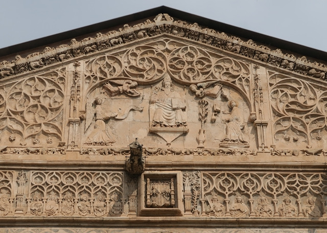 [남쪽 입구 위: 가운데 앉아있는 인물은 예수, 왼쪽은 수태고지를 하는 대천사 가브리엘, 오른쪽은 수태고지를 받는 마리아. 마리아 앞에 당시 읽고 있었다던 구약 성서와 순결을 상징하는 백합 화분이 있다]