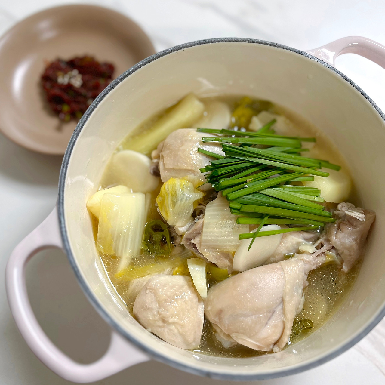 하얀 식탁에 놓인 연분홍빛 무쇠 냄비. 그 안에서 뽀얗게 푹 익은 닭고기와 채소들. 바라보고만 있어도 포근한 느낌이 든다. 누군가 내 뒤에 다가와 양어깨를 따스하게 안고 품어 주는 것 같은 그런 기분.