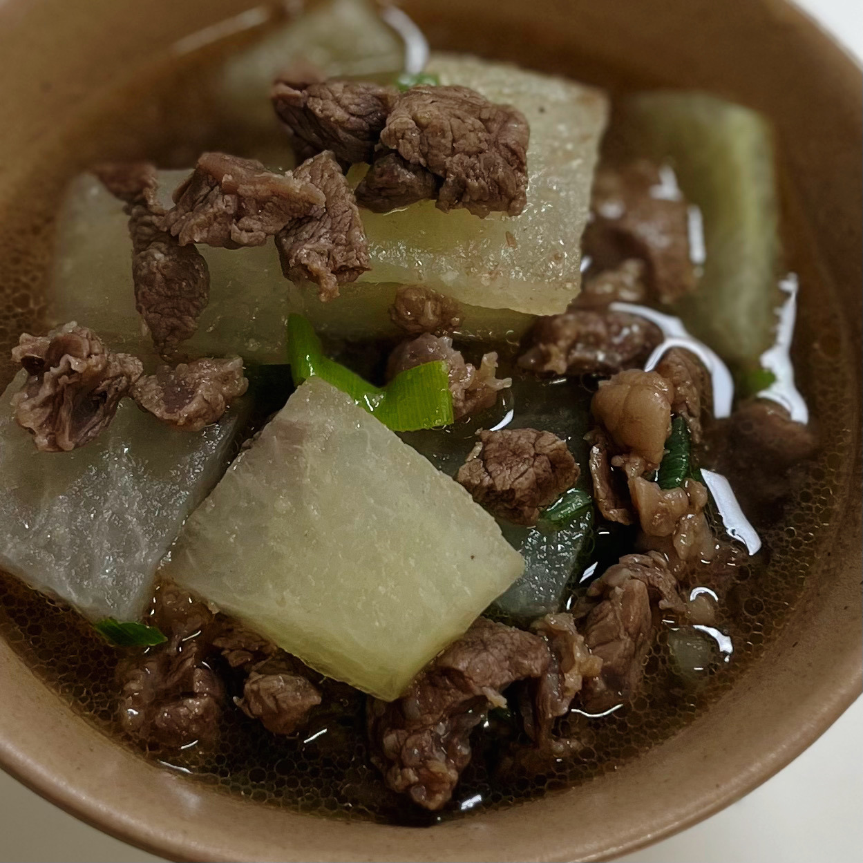 냄비에 참기름을 조금 두르고 손가락 한 마디 크기 정도로 잘린 국거리용 소고기를 볶는다. 국간장 한 숟갈, 다진 마늘 한 숟갈도 함께 넣어 살살 볶는다. 짭짜름하고 콤콤한 냄새가 올라온다. 고기 표면의 핏기가 살짝 가실 때까지 볶은 후 물을 600밀리리터 붓는다. 강한 불로 끓이다가 국물이 끓어오르면 무를 모두 쏟아내듯 넣는다. 불을 중간 정도로 줄이고 국간장 반 숟가락, 참치액 한 숟가락으로 간을 한다. 불을 약하게 줄인 다음 무가 반투명해질 때까지 푹 끓인다.