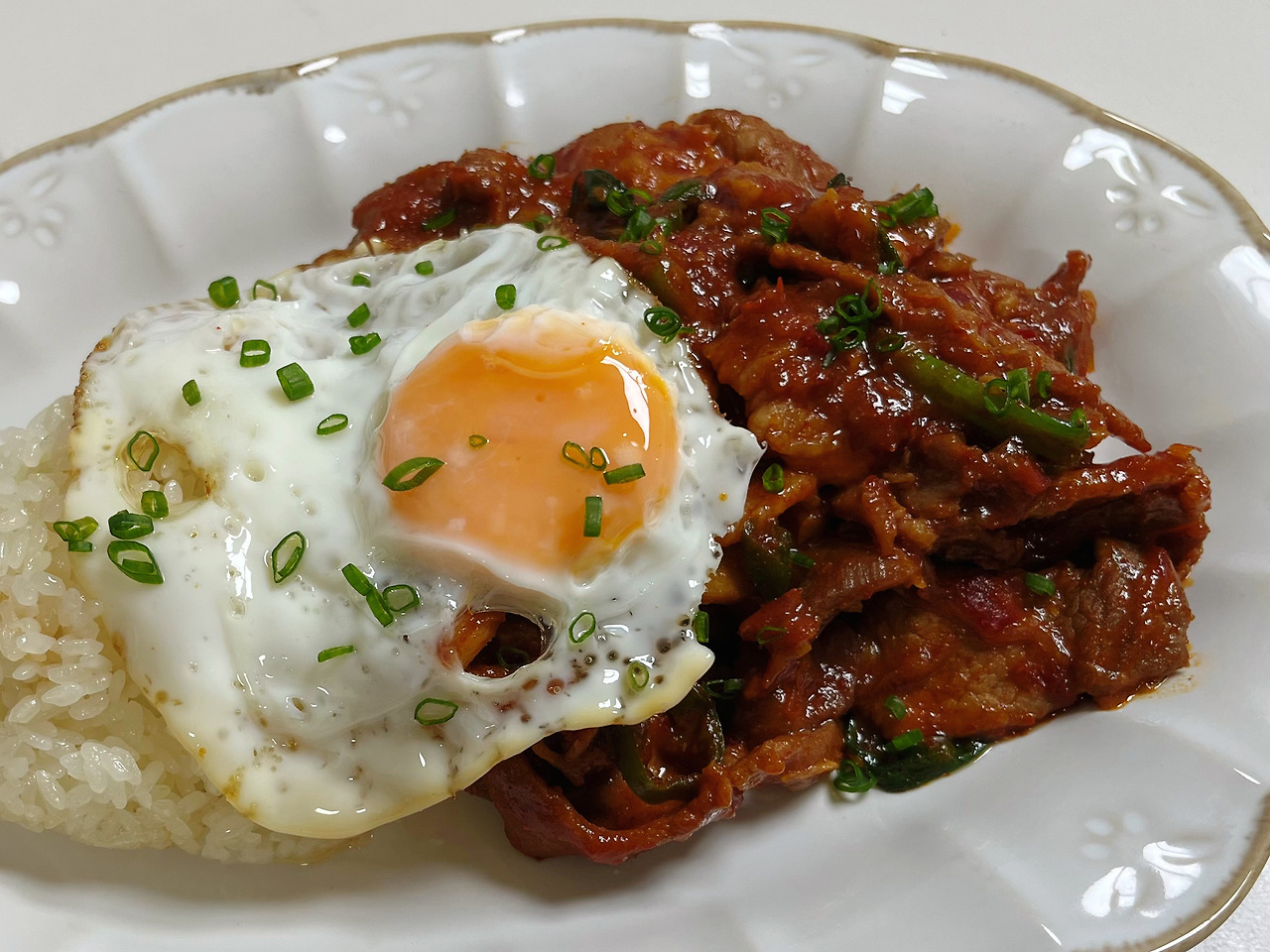 중국 식당에서 볶음밥을 시키면 으레 나오는 길쭉한 타원형 그릇과 얼추 비슷한 생김새의 그릇을 꺼낸다. 잰 발걸음으로 압력밥솥으로 가 뽀얀 흰밥을 그릇 왼편에 푼다. 오른편에는 방금 막 완성해 뜨거운 열을 내고 있는 제육볶음을 인심 좋게 가득 담는다. 미리 튀겨 둔 계란프라이는 하얀 밥과 빨간 제육볶음을 공평하게 반반 차지할 수 있는 위치에 얹는다. 밥과 제육볶음이 각각 경쟁적으로 피워올리고 있던 수증기 위에 계란프라이가 이불처럼 덮인다. 잘게 썬 쪽파잎도 여기저기 슬쩍슬쩍 뿌린다.