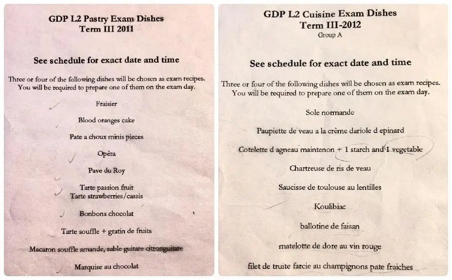 과정의 성패를 결정짓는 기말고사(Cuisine Exam, Pastry Exam)는 사뭇 진지하게 생각해야 되는데, 평가는 객관식으로 이루어진 이론 시험과 각 요리의 재료와 양을 적어내는 암기 시험, 그리고 실습으로 구성된다.
