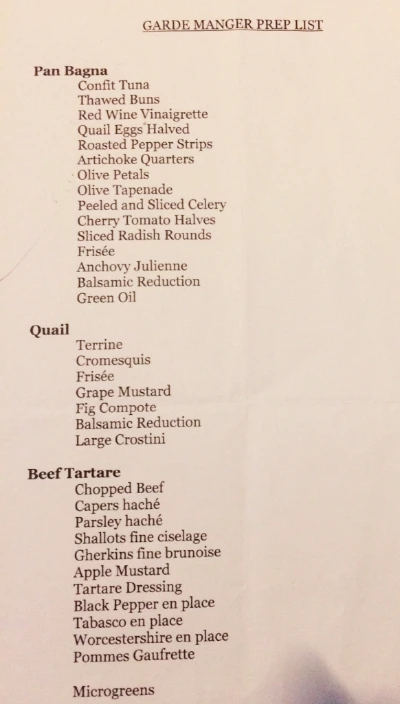 다음은 Jay에게 주어진 Prep. Lists이며 "Garder Manger"로서 한 주간 필요한 재료와 요리들이 정리되어 있었다.