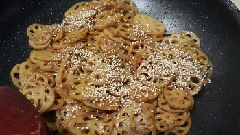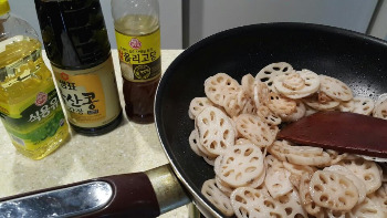 3. 팬에 연근을 넣고 식용유를 두르고 볶아요.