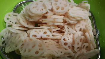 2. 납작하게 썬 연근을 물에 씻어서 녹말기를 빼 줘요.