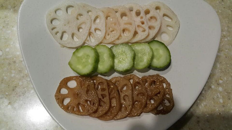 1. 연근의 껍질을 벗기고 납작하게 썰어요.
